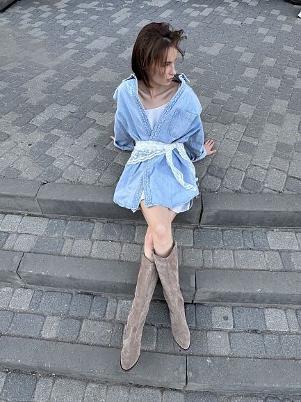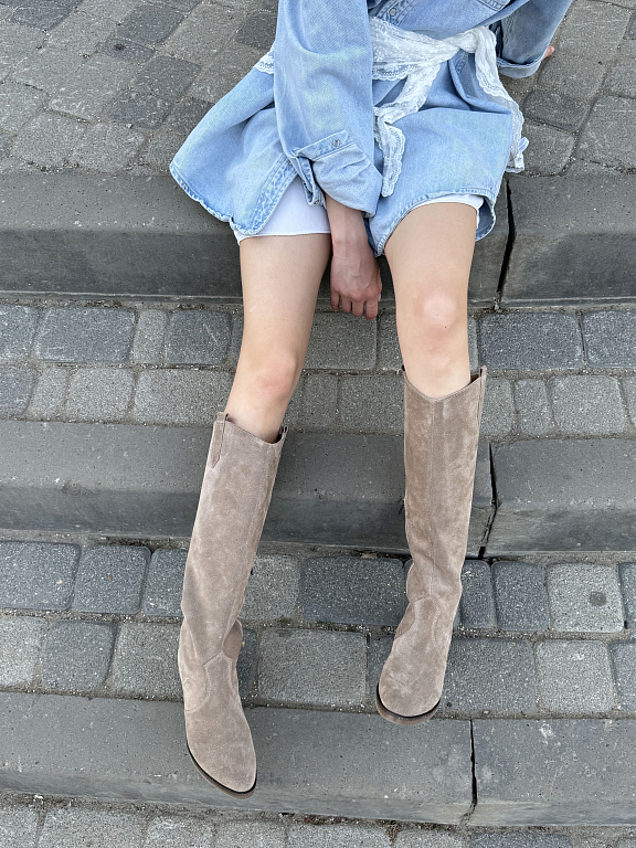 Материал: 100% натуральная замша Материал подклада: байка/шерсть (на выбор) Высота ботинка (без учета подошвы): 42 см Высота подошвы: 1 см Высота каблука: 5.5 см Сезон: демисезонные (от +10 до-15)/ зима до -30°С