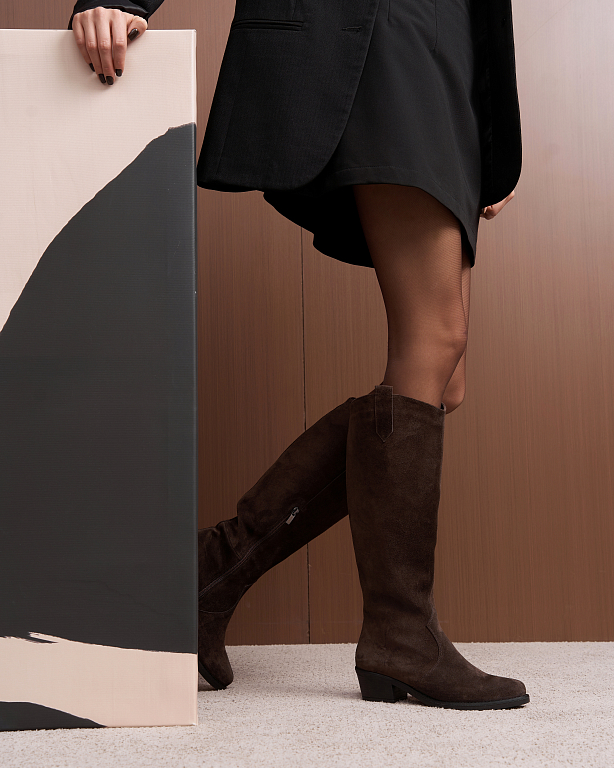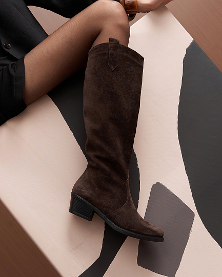 Казаки— это универсальная пара, которая легко впишется в гардероб и подчеркнёт вашу индивидуальность. Характерный каблук, скошенный верх и мягкая натуральная замша создают гармоничный образ, в котором сочетаются актуальные тенденции и удобство на каждый день.